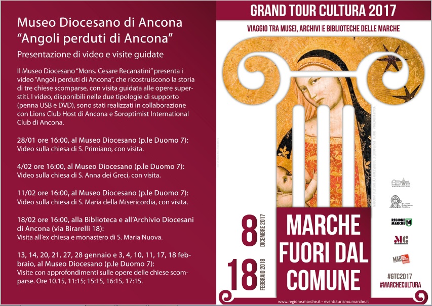 Il Museo Diocesano di Ancona Mons. Cesare Recanatini, in occasione del Grand Tour Cultura 2017 – Marche fuori dal Comune promosso dalla Regione Marche, presenta, per la prima volta in versione integrale, i video Angoli perduti di Ancona, che ricostruiscono la storia di tre chiese scomparse, con visita guidata alle opere superstiti. I video, disponibili nelle due tipologie di supporto (penna USB e DVD), sono stati realizzati in collaborazione con Lions Club Host di Ancona e Soroptimist International Club di Ancona.