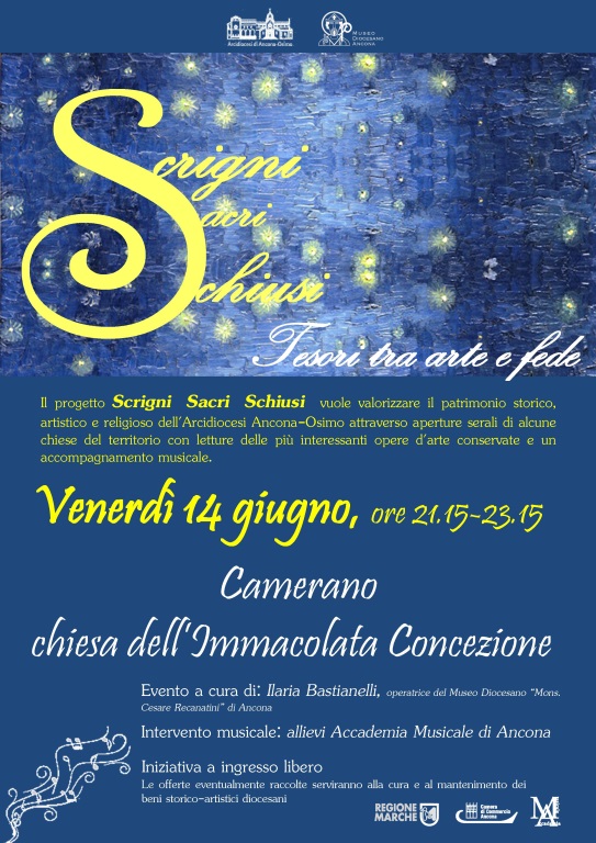 Primo appuntamento serale con la rassegna estiva Scrigni Sacri Schiusi. Tesori tra arte e fede, a cura del Museo diocesano, a Camerano, presso la Chiesa dell’Immacolata Concezione, alle ore 21.15. La serata prevede la lettura iconorafica dei dipinti contenuti nella chiesa a cura di Ilaria Bastianelli e un intervento musicale delle voci degli allievi dell’Accademia Musicale di Ancona accompagnate al piano dal M° Marica … Continua a leggere Scrigni Sacri Schiusi. Primo appuntamento a Camerano