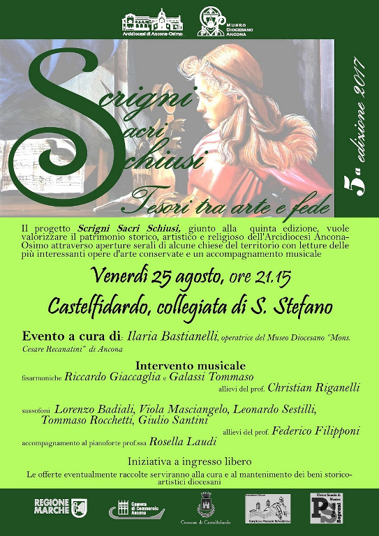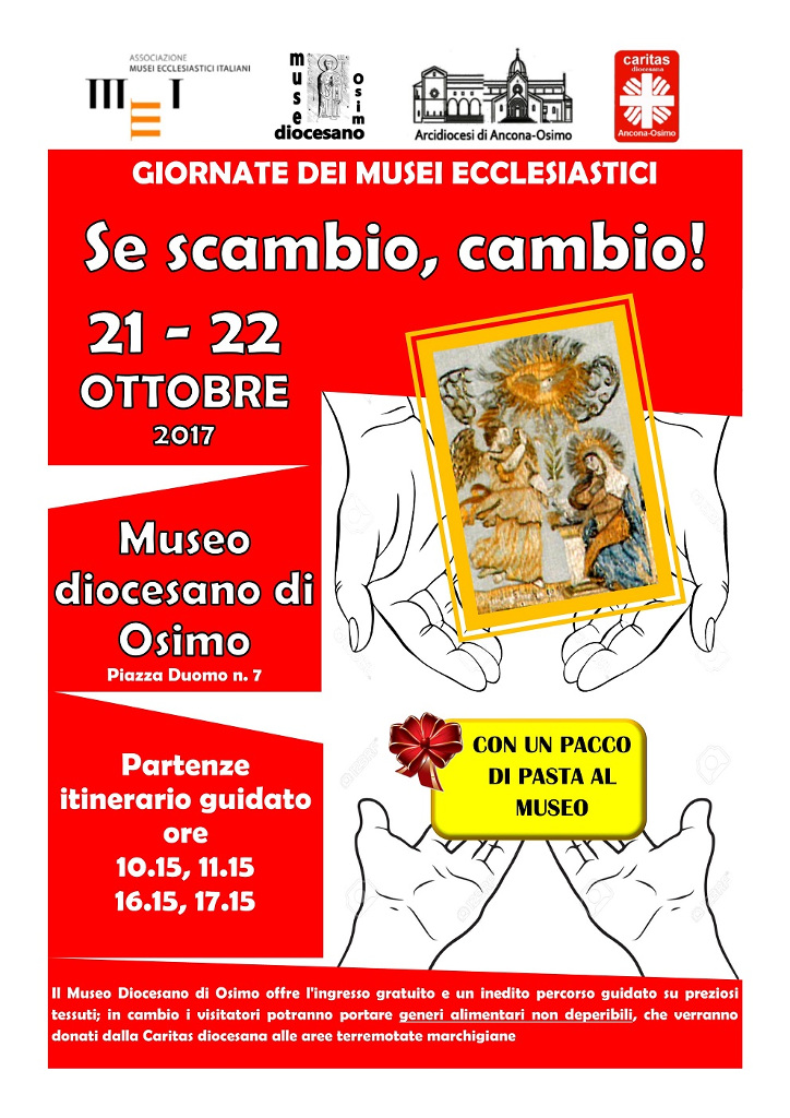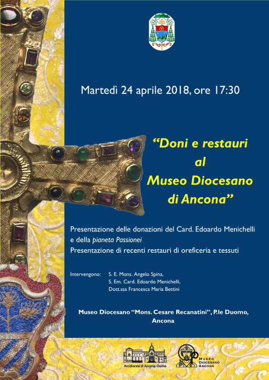 Importante appuntamento al Museo Diocesano “Mons. Recanatini” di Ancona per la presentazione delle donazioni da parte del Cardinale Edoardo Menichelli e dell’erede della famiglia Passionei. Si tratta di oreficerie e volumi, donati dal Cardinale all’Arcidiocesi che ha guidato per tanti anni. Inoltre l’erede Francesca Maria Bettini ha voluto omaggiare il Museo e la collettività della preziosa Pianeta Passionei, appartenuta per secoli alla sua famiglia. … Continua a leggere Doni e restauri al Museo Diocesano di Ancona