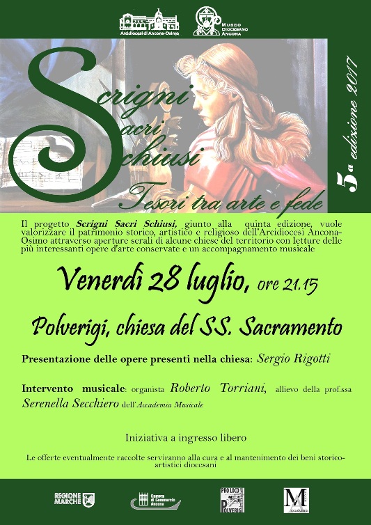 Terzo appuntamento serale di Scrigni Sacri Schiusi: la rassegna prosegue a Polverigi venerdì 28 luglio ore 21.15 con la chiesa del Santissimo Sacramento. Il prof. Sergio Rigotti svelerà al pubblico le meraviglie della chiesa, mentre l’intervento musicale sarà a cura dell’Accademia Musicale di Ancona con l’organista Roberto Torriani, allievo della prof.ssa Serenella Secchiero. Ingresso libero.