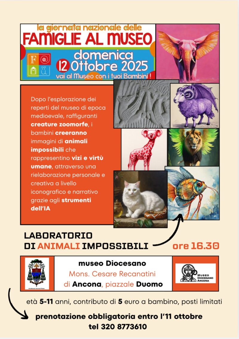 Domenica 12 ottobre  2025, FAMU, Famiglie al Muse Vi aspettiamo domenica 12 ottobre alle ore 16.30 al Museo diocesano “Mons. Cesare Recanatini” di Ancona con i vostri bambini. In occasione della giornata nazionale delle famiglie al Museo, abbiamo organizzato un interessante percorso guidato alla scoperta degli animali e dei loro significati nascosti attraverso alcune delle opere presenti nel Museo diocesano. A seguire verrà proposta un’attività … Continua a leggere Famiglie al Museo 2025 al Museo diocesano di Ancona »