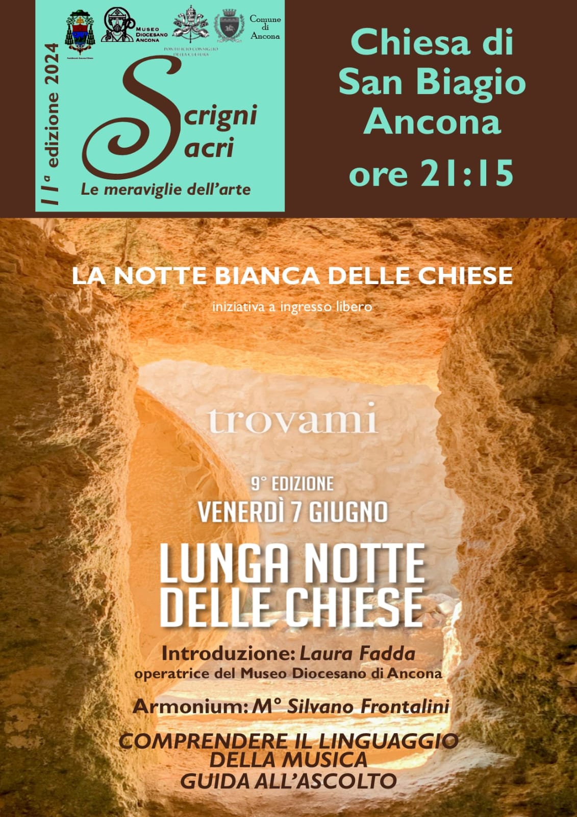 COMUNICATO STAMPA – Venerdì 7 giugno 2024, a partire dalle ore 21.15, presso la chiesa di San Biagio di Ancona, si apre il format delle aperture serali della rassegna Scrigni Sacri con l’evento di portata nazionale La lunga notte delle chiese.