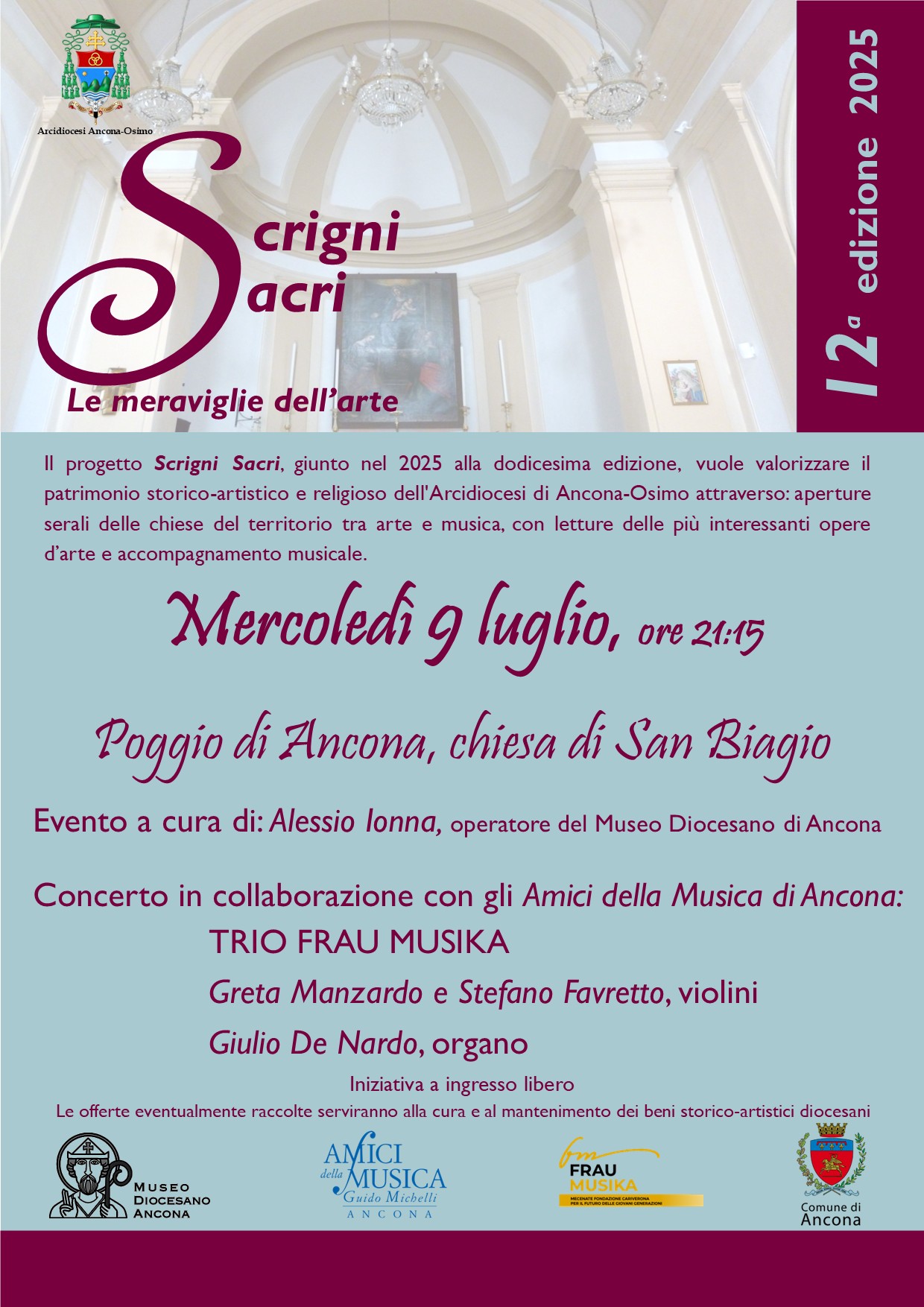 Il dott. Alessio Ionna, operatore del Museo diocesano, guiderà il pubblico raccontando la storia della chiesa di scuola vanvitelliana, a seguire il concerto del Trio Frau Musika, con Greta Manzardo e Stefano Favretto al violino e Giulio De Nardo all’organo in collaborazione con gli Amici della Musica di Ancona.