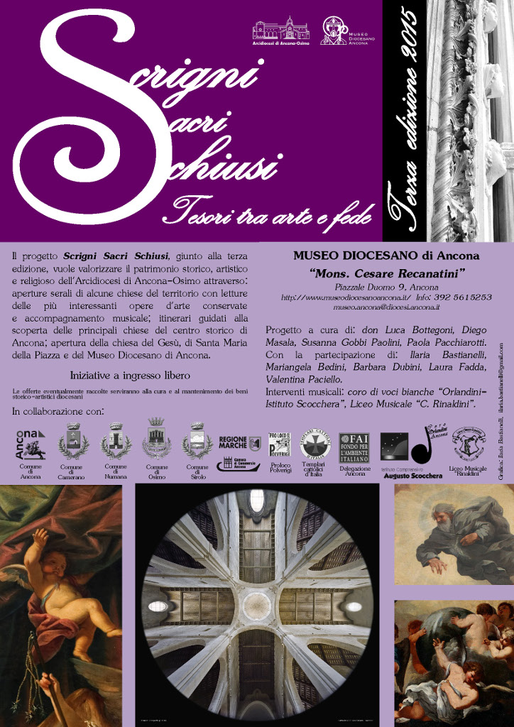 Dopo il grande successo delle scorse edizioni, torna Scrigni Sacri Schiusi. Tesori tra arte e fede, la rassegna a cura dell’Ufficio Beni Culturali dell’Arcidiocesi di Ancona–Osimo e del Museo Diocesano di Ancona “Mons. Cesare Recanatini”, con una ricca serie di appuntamenti artistici e musicali tra Ancona, Camerano, Numana, Osimo, Polverigi e Sirolo. La terza edizione prevede un ricco calendario di eventi per tutta l’estate fino ad ottobre 2015 per raccontare l’arte, la storia, la fede e le tradizioni dell’Arcidiocesi di Ancona-Osimo.