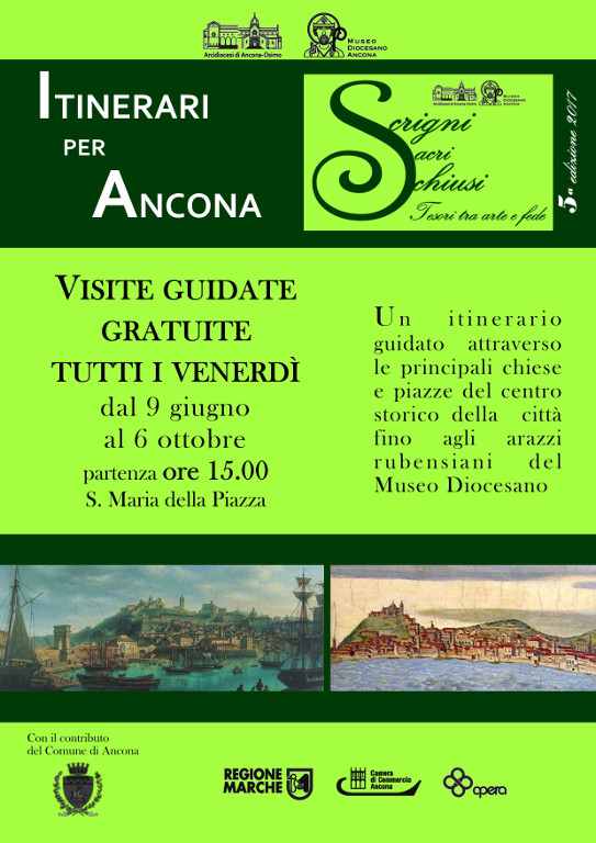 Tutti i venerdì pomeriggio, in occasione anche degli sbarchi dei croceristi, a partire dal 9 giugno fino al 6 ottobre, in collaborazione con il Comune di Ancona, si svolgeranno gli itinerari con visita guidata attraverso le principali piazze ed edifici religiosi di Ancona, quali le chiese di Santa Maria della Piazza, San Domenico, San Francesco alle Scale, Gesù, Cattedrale di San Ciriaco e conclusione con gli arazzi di Rubens al Museo Diocesano (ritrovo ore 15.00 a Santa Maria della Piazza, durata circa 3 ore).