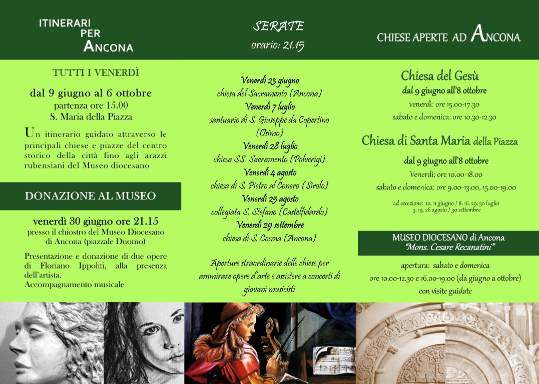 Tra le altre proposte della rassegna, l’apertura straordinaria delle chiese di Santa Maria della Piazza e del Gesù di Ancona dal 9 giugno all’8 ottobre. A cura del FAI (Fondo Ambiente Italiano), Delegazione di Ancona le aperture della chiesa del Gesù, tutti i venerdì (ore 15.00-17,30), i sabati e le domeniche (ore 10.30-12.30); mentre l’Associazione Templari Cattolici d’Italia di Ancona conferma le aperture di Santa Maria della Piazza, il venerdì (ore 10.00-18.00), il sabato e la domenica (ore 9.00-13.00, 15.00-19.00).