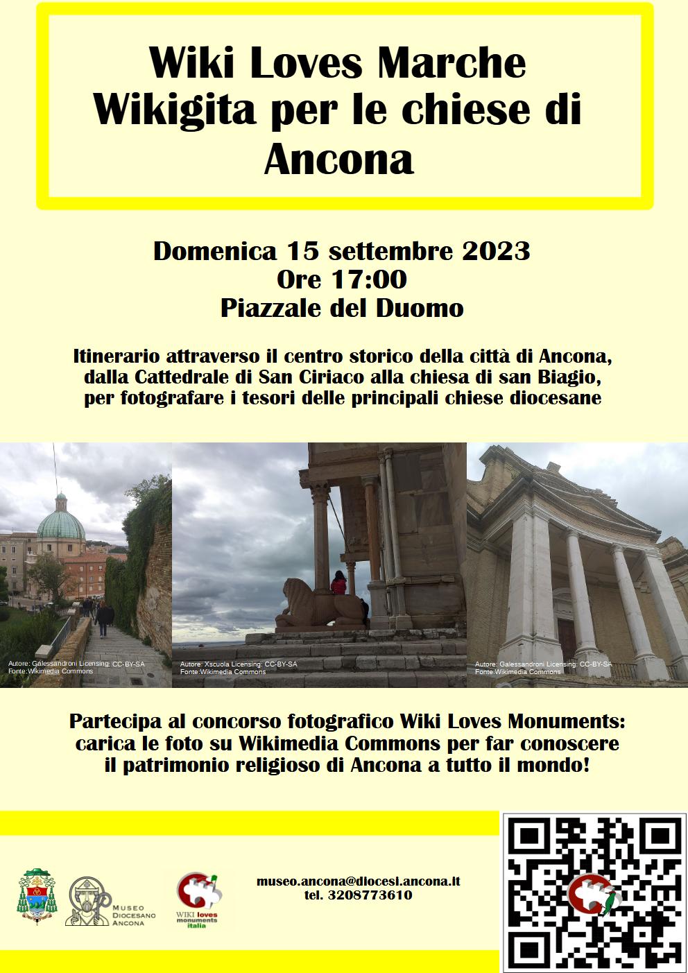 Anche quest’anno, in occasione del concorso fotografico “Wiki Loves Monuments”, la Diocesi di Ancona Osimo e il Museo diocesano “Mons. Cesare Recantini” organizzano una Wikigita attraverso le principali chiese del centro storico di Ancona. Domenica 15 settembre, accompagnati da un operatore del Museo diocesano, i partecipanti saranno chiamati a riscoprire e fotografare il patrimonio storico-artistico delle chiese diocesane della città, attraverso un itinerario che parte dalla cattedrale di San Ciriaco fino alla chiesa di San Biagio.